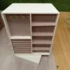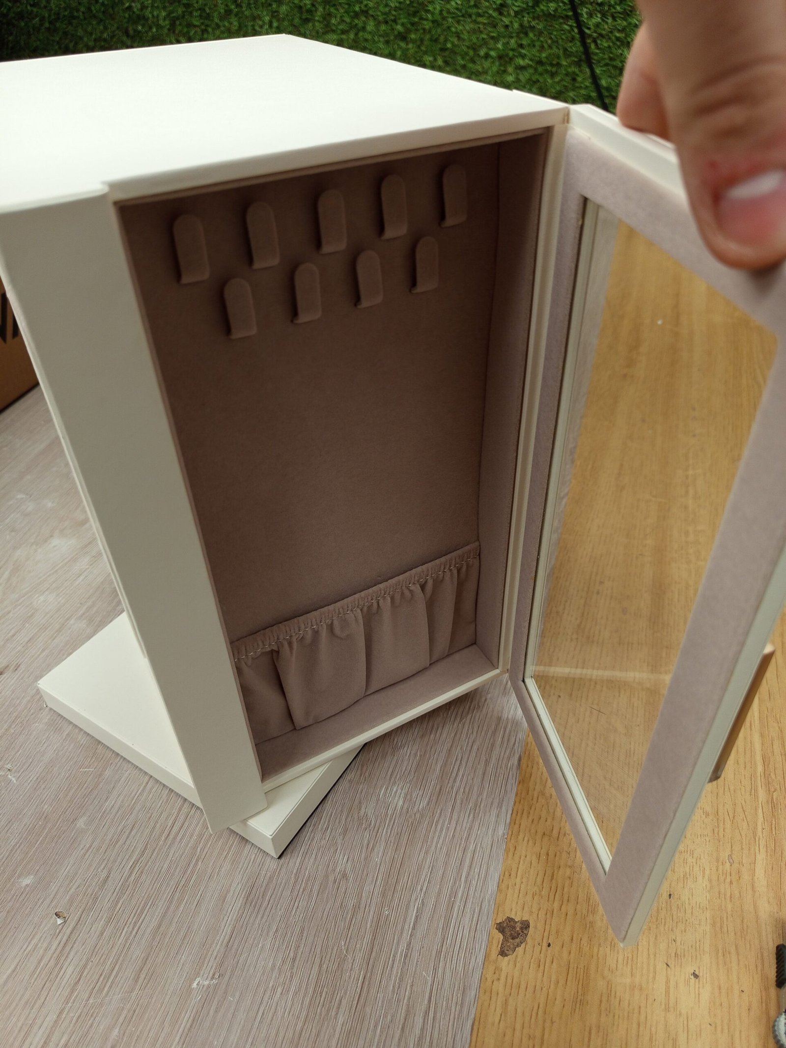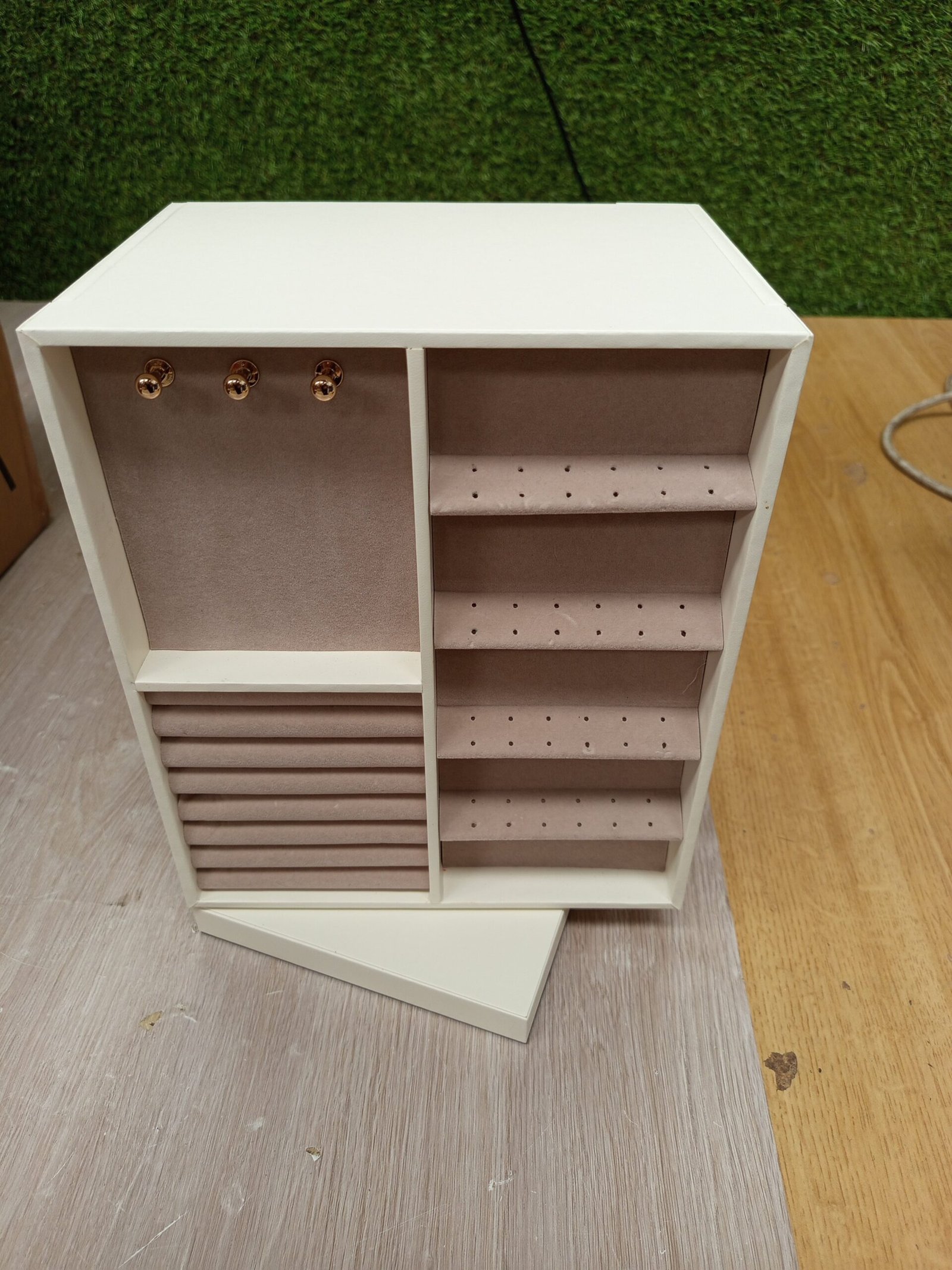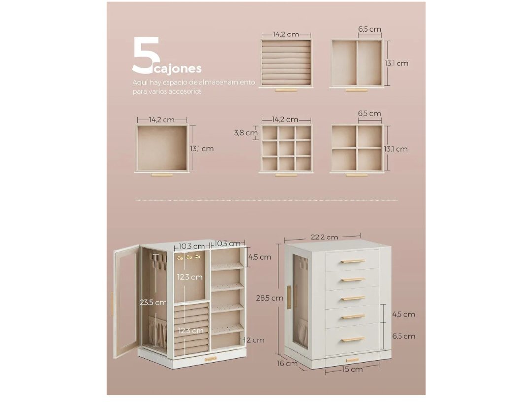 Este joyero de 16 x 22,2 x 28,5 cm es espacioso. Delante: soportes para anillos, ganchos para pulseras, agujeros para pendientes; detrás: 5 cajones para broches y pinzas para el pelo; lados: 18 ganchos para collares