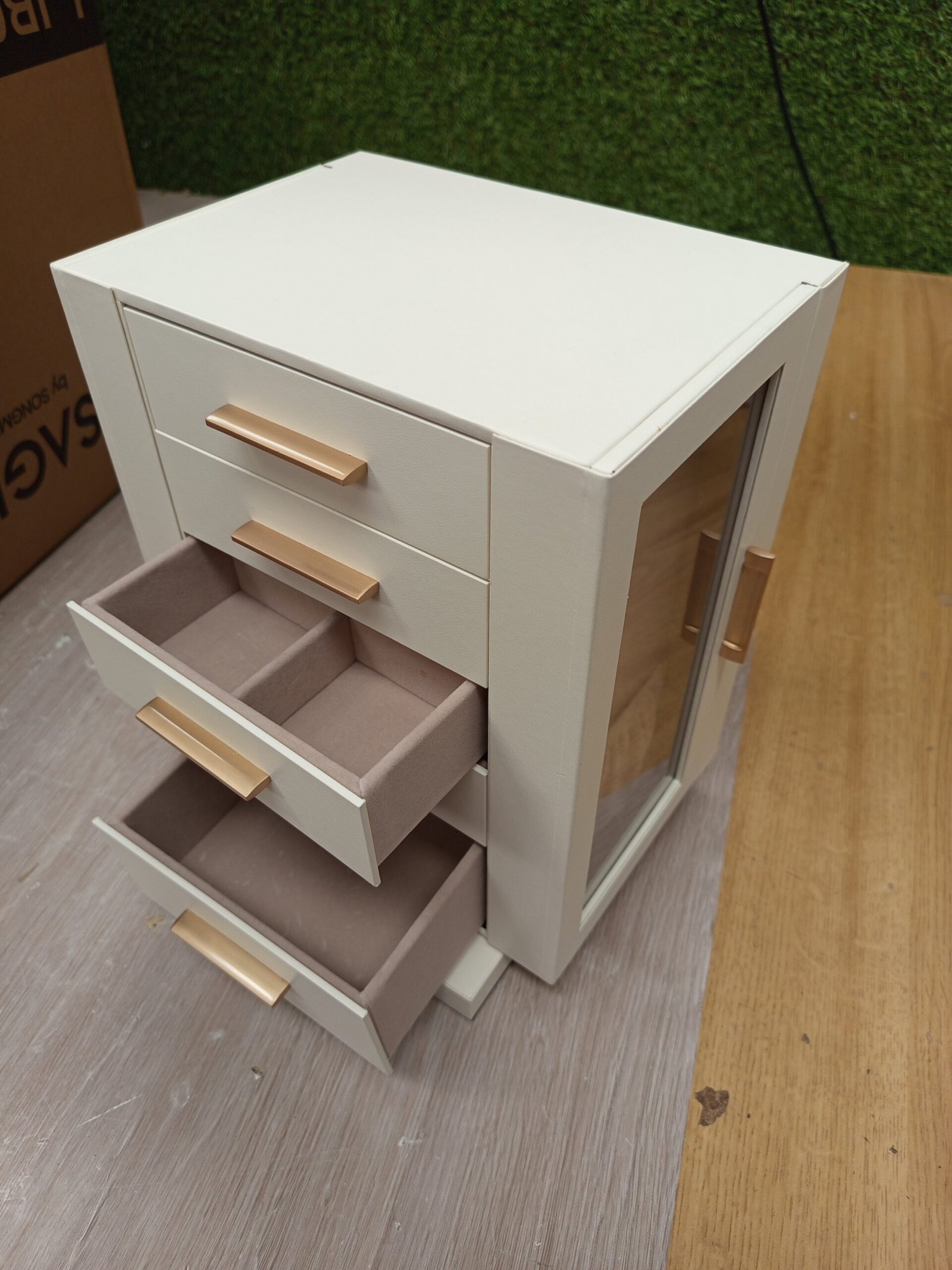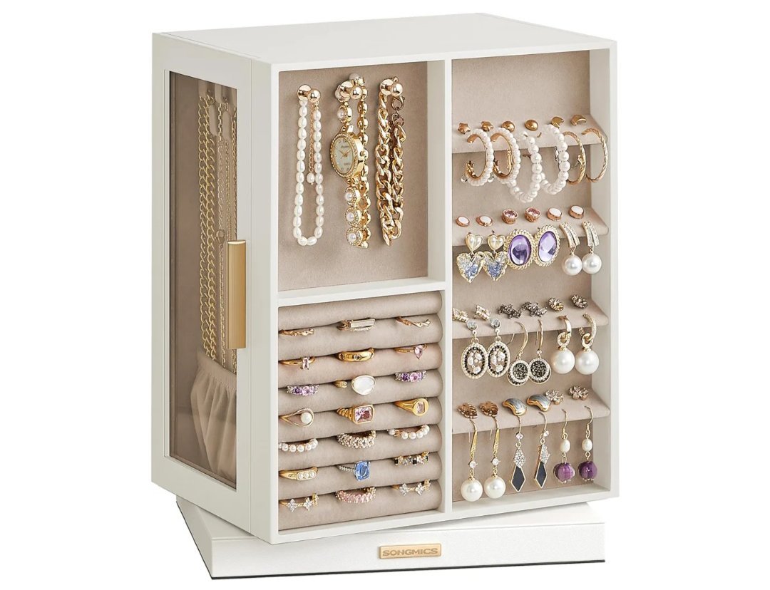 SONGMICS Caja Joyero Giratorio 360°, Caja de Joyas con 5 Cajones, Ventanas Laterales de Cristal, Gran Capacidad, Almacenamiento Vertical, Diseño Abierto, Idea de Regalo, Blanco Nube JBC170W01