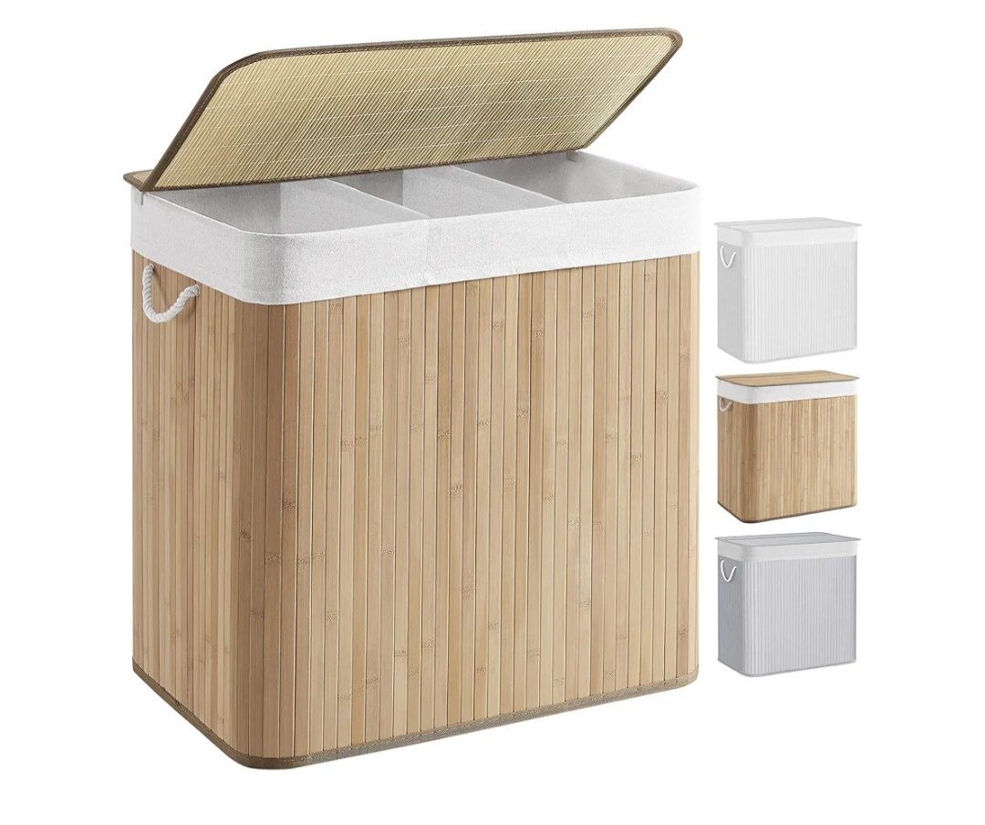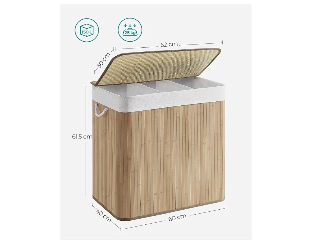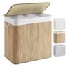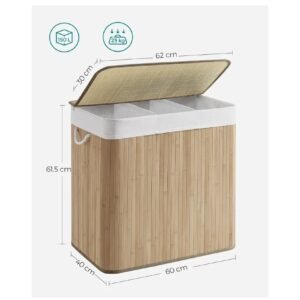 SONGMICS – Cesta de lavandería (150 L, 3 compartimentos de clasificación, tapa de bambú, asas, plegable, bolsa extraíble lavable a máquina, para lavandería, dormitorio, color madera LCB091N01