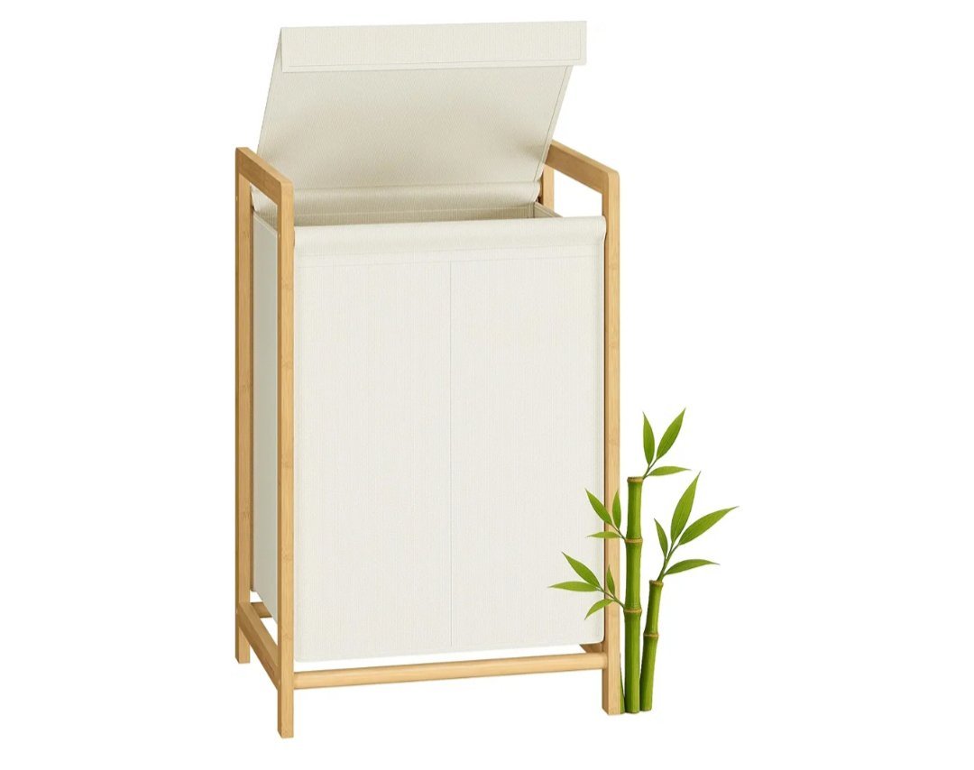 SONGMICS Cesto para Ropa Sucia de 2 Compartimentos, Marco de Bambú, Tapa Reforzada y Extraíble, Bolsa Interior Desmontable, 100 L, Blanco Crema RLH102WD01