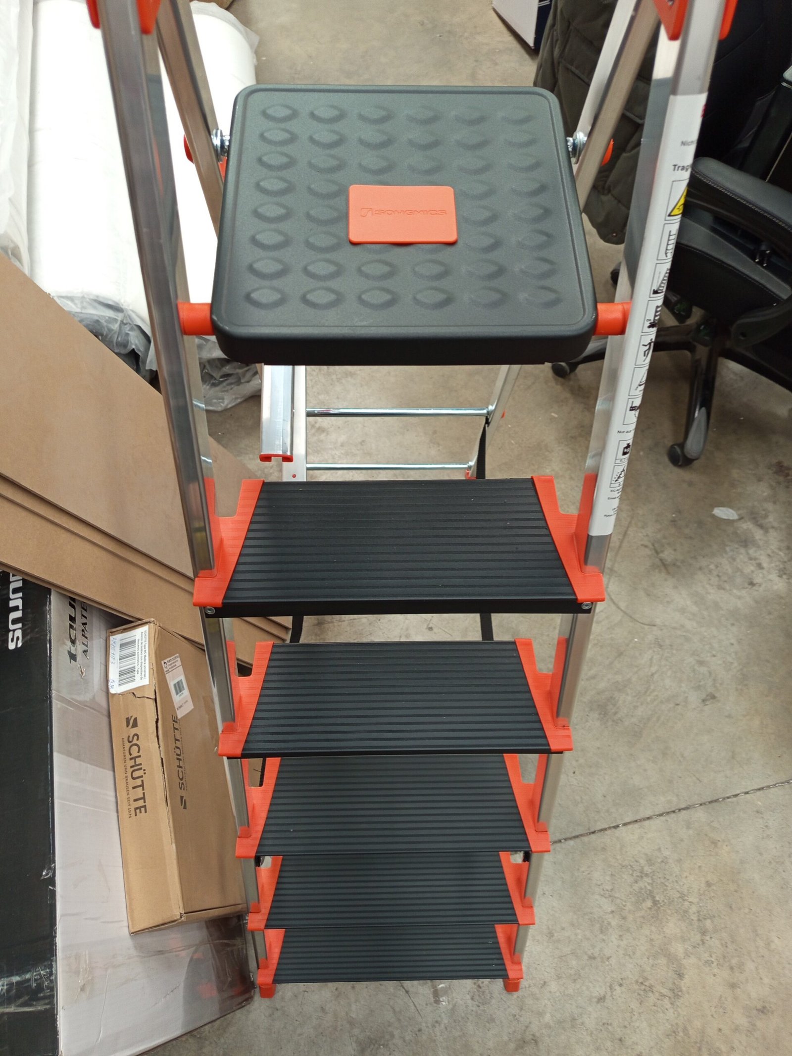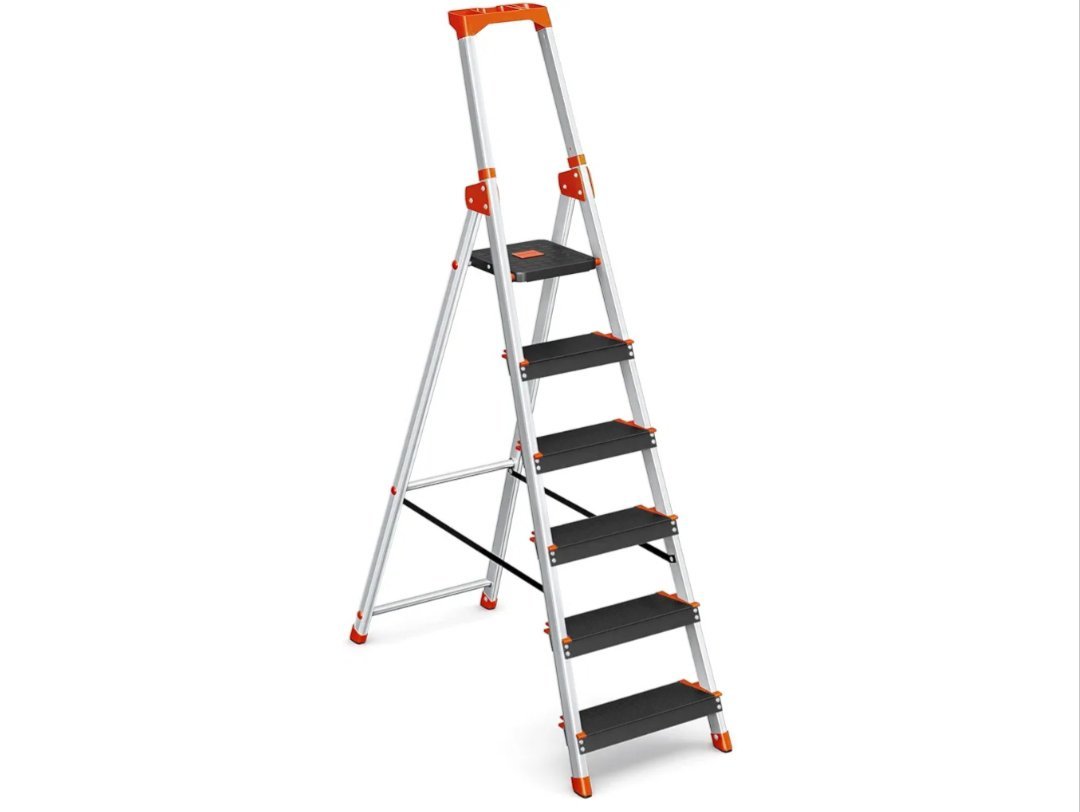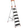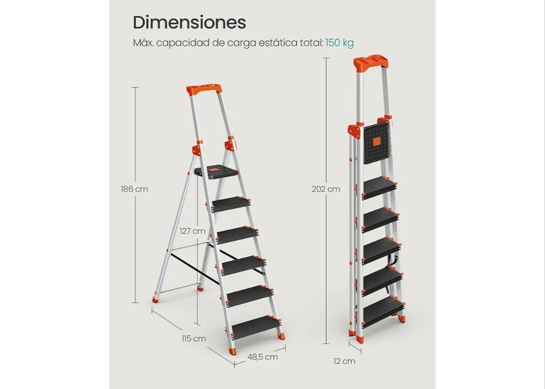 SONGMICS Escalera de 6 Peldaños, Escalera de Aluminio con Peldaños de 12 cm de Profundo, Plegable, Bandeja y Pies Antideslizantes, Carga de 150 kg, Negro y Naranja GLT06BK