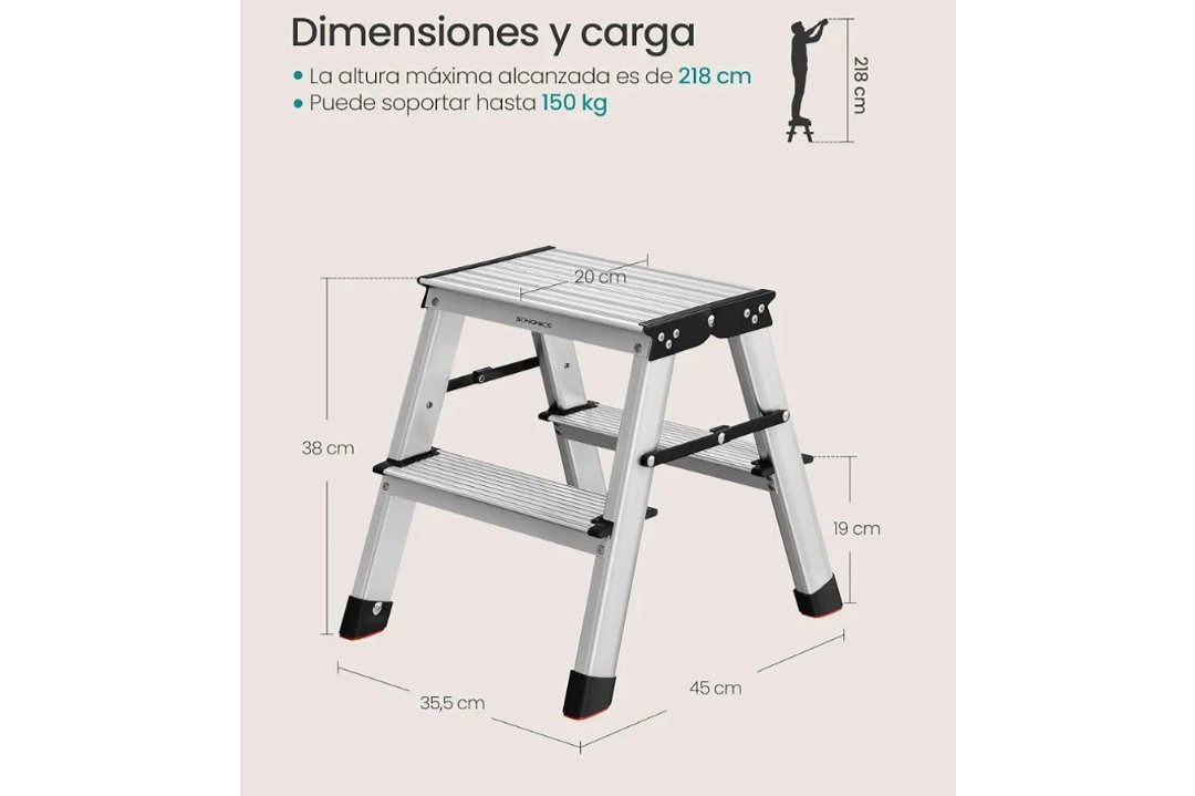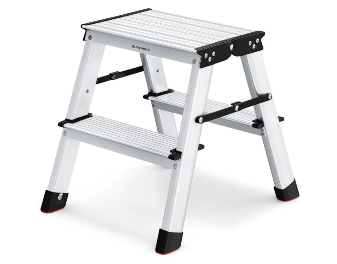 SONGMICS Escalera Plegable, Escalera de Mano, Escalera de Aluminio con 2 Peldaños Antideslizantes, Multifuncional, Carga de 150 kg, Gris Plata y Negro Tinta GLT012E01