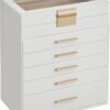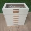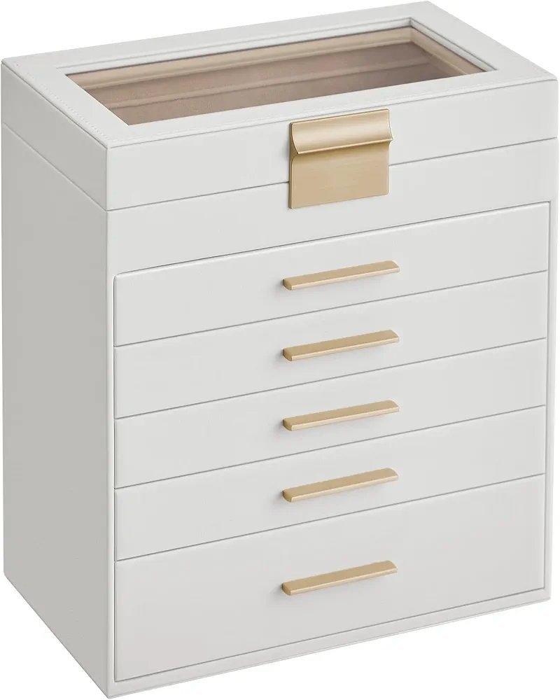 SONGMICS Caja de Joyas, Caja Joyero con 6 Niveles, Estuche para Joyería con Tapa de Cristal, 5 Cajones, para Gafas de Sol, Joyas Grandes, Moderno, Blanco Nube y Dorado JBC171W01