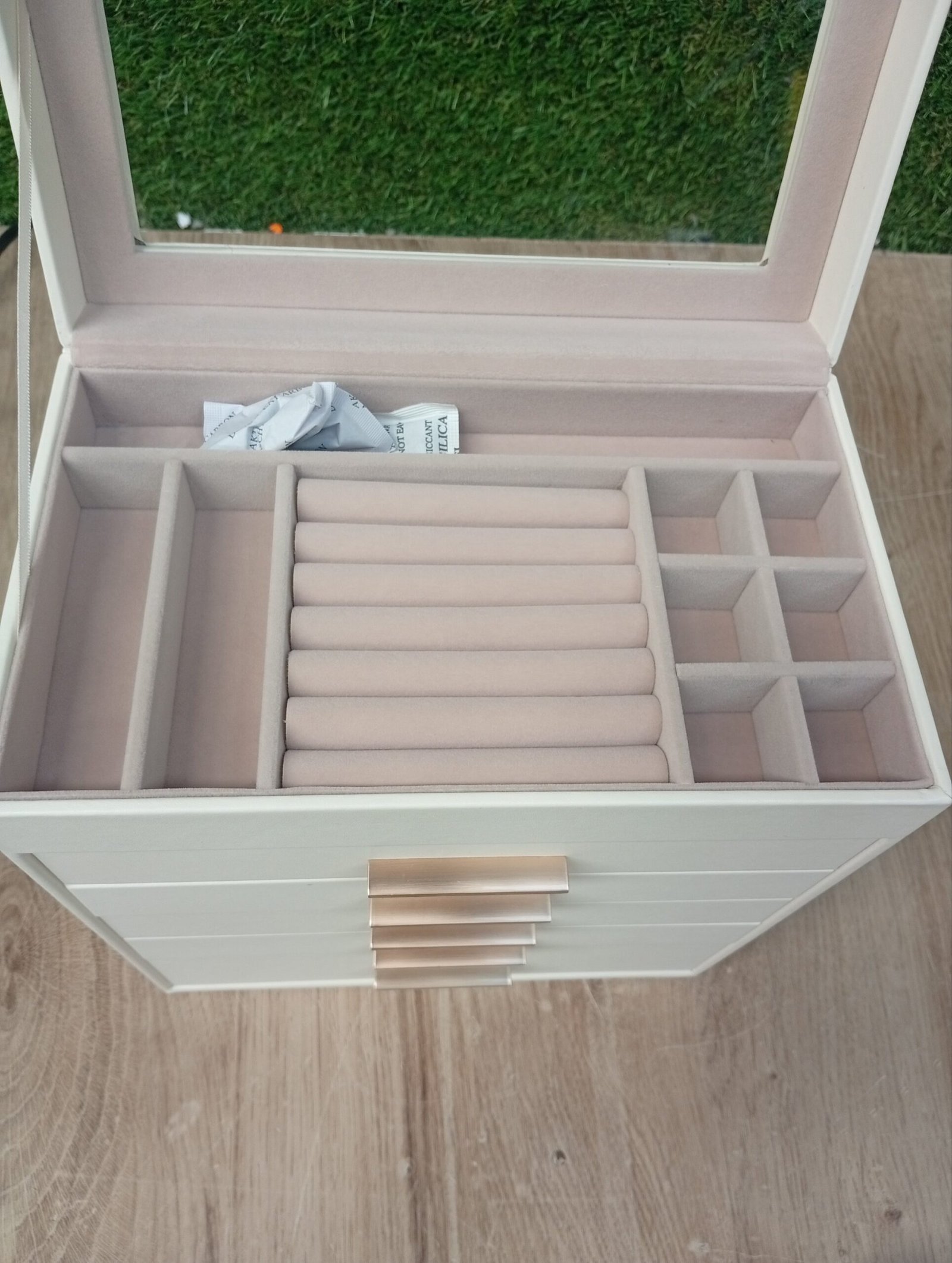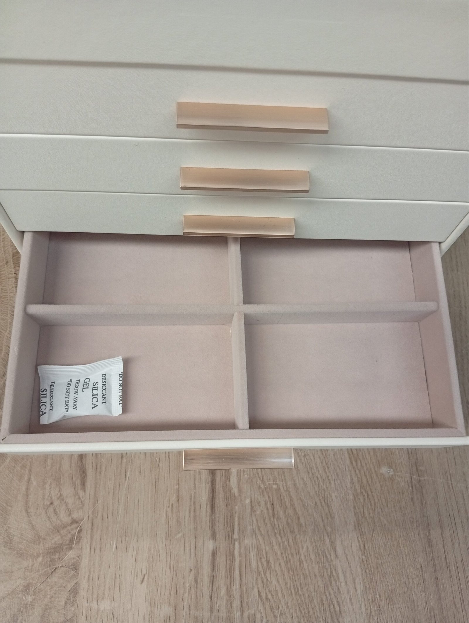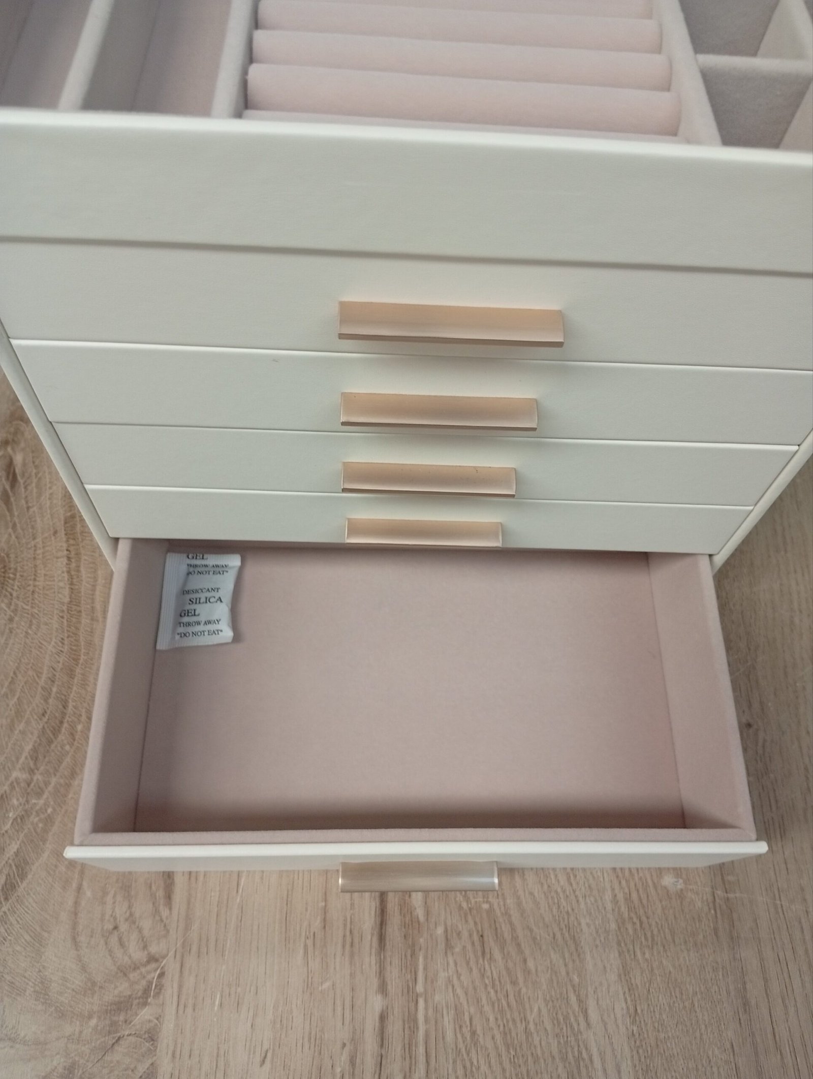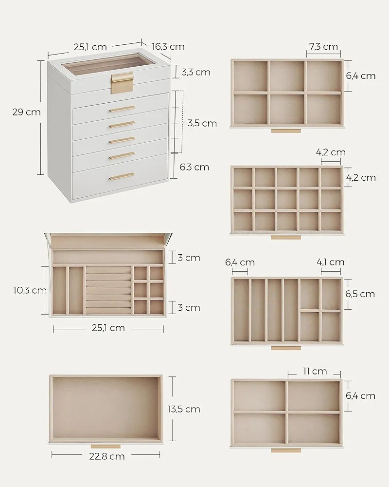 [Almacenamiento de 6 niveles] Guarda tus accesorios de forma ordenada en esta caja de joyas. Las joyas pequeñas se guardan en los 5 compartimentos de diferentes tamaños, las gafas de sol y los relojes están en el cajón grande del fondo
