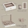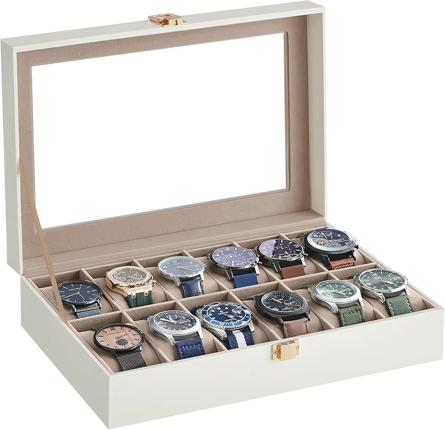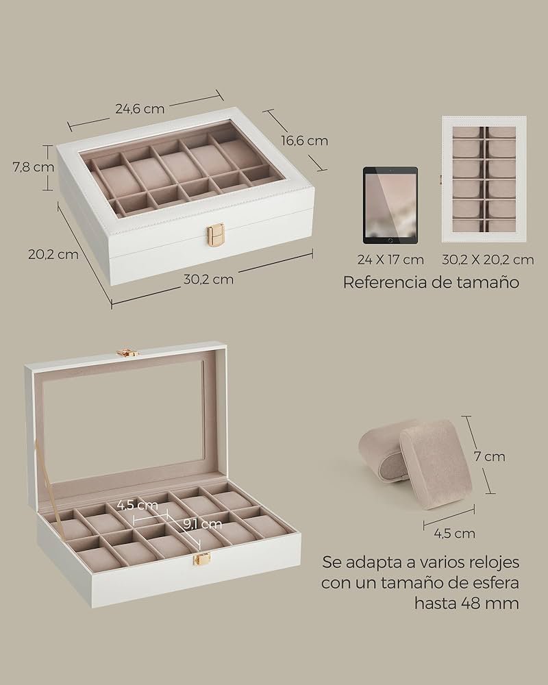 SONGMICS Caja de Relojes con 12 Compartimentos, Estuche de Relojes con Tapa de Cristal, Cojín Extraíble, Cierre Metálico, Regalo, Cuero Sintético Blanco Nube y Forro Beige Capuchino JWB120W01