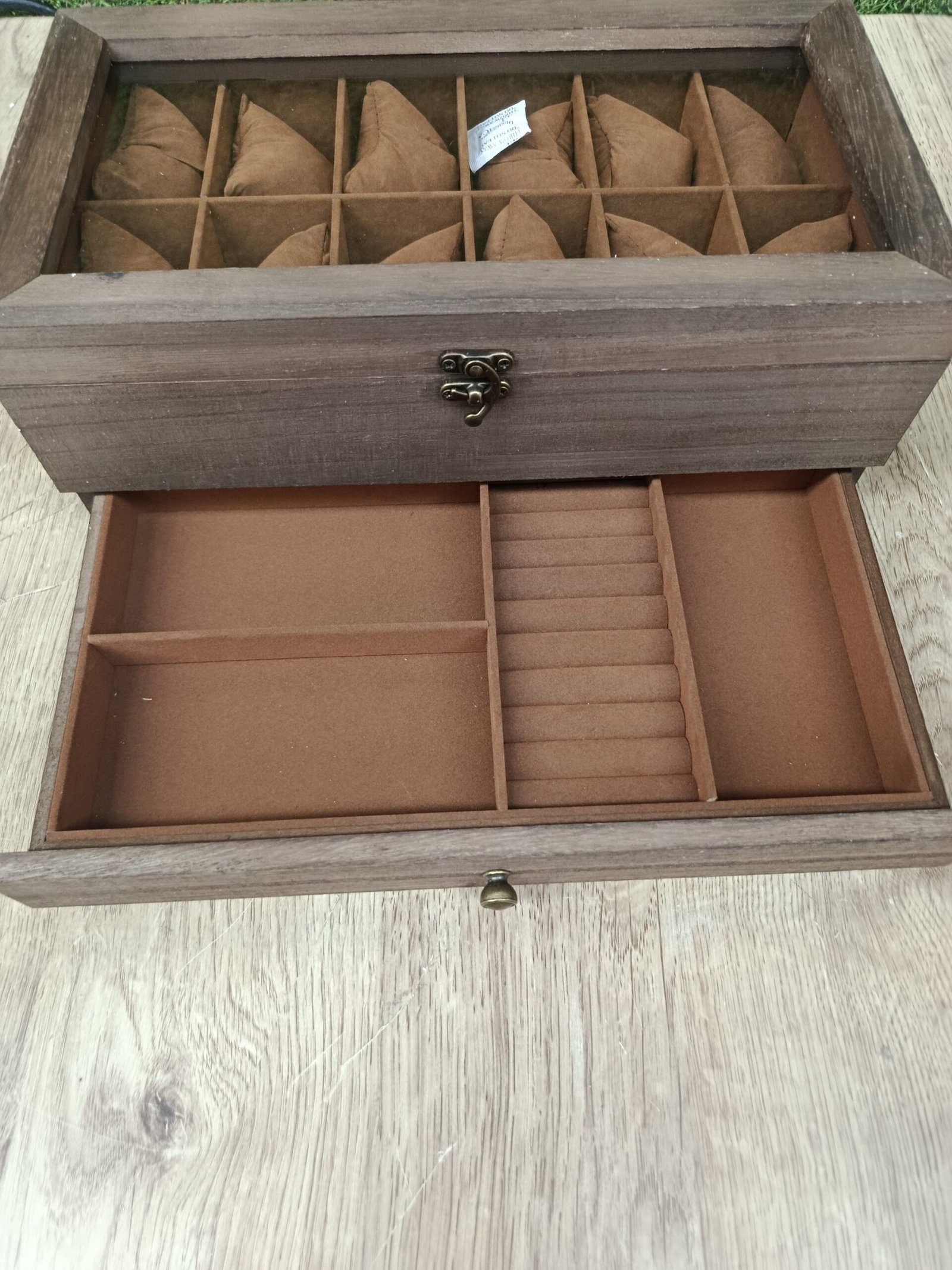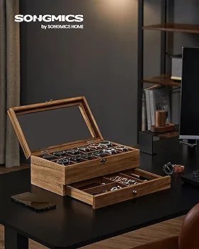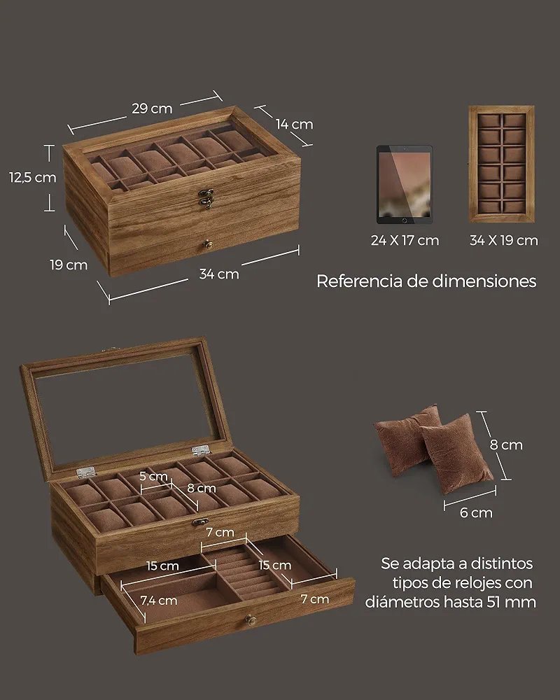 [Grande y con compartimentos] Hay 12 ranuras para relojes en la parte superior y varios compartimentos en el cajón inferior para tus pulseras y anillos. Esta caja para relojes de 2 niveles te permite guardar tus relojes y joyas