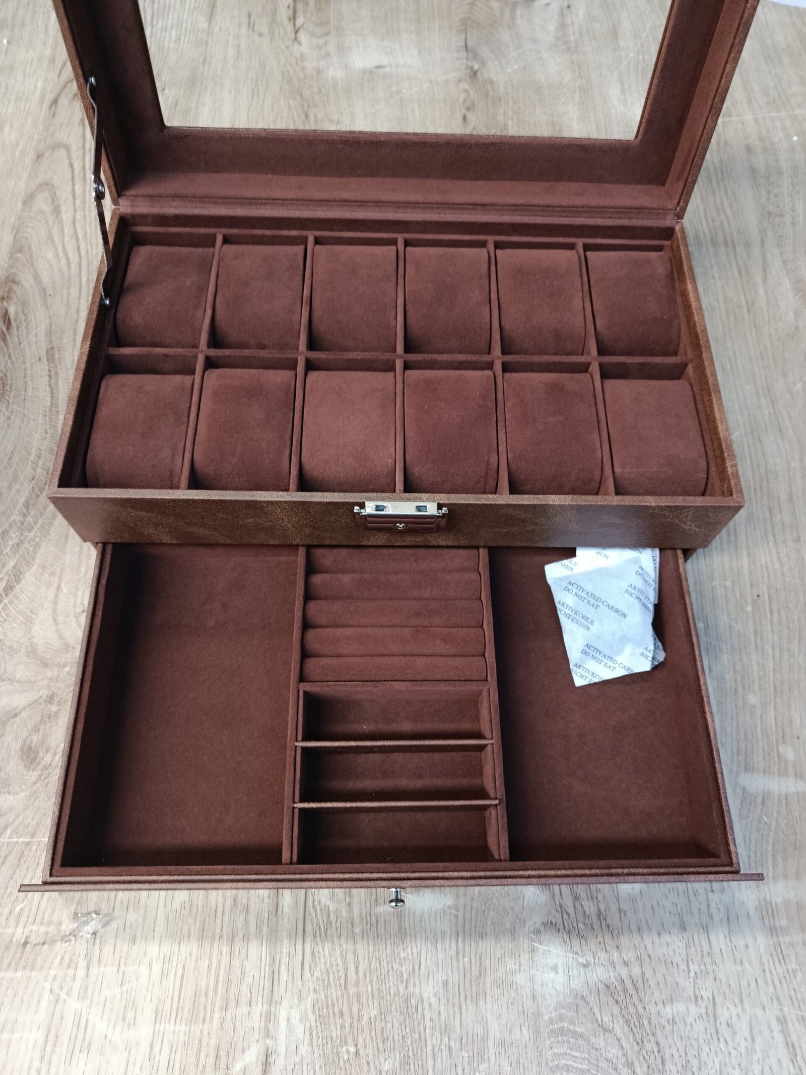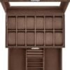 [2 niveles para relojes y más] Esta caja para relojes cuenta con 12 ranuras en la parte superior para relojes con un tamaño de pantalla de hasta 48 mm. Varios compartimentos en el cajón inferior pueden almacenar tus anillos, pulseras y otras joyas
