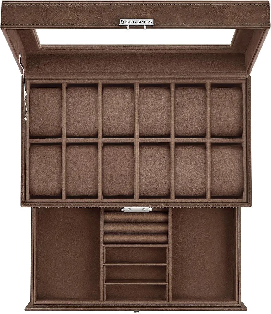 SONGMICS Caja de Reloj, Estuche de Reloj con Tapa de Cristal de 2 Niveles para 12 Relojes, Cerradura, 1 Cajón, para Anillos Pulseras, Regalo Ideal, Cuero Sintético Marrón, Forro Marrón JWB012K01