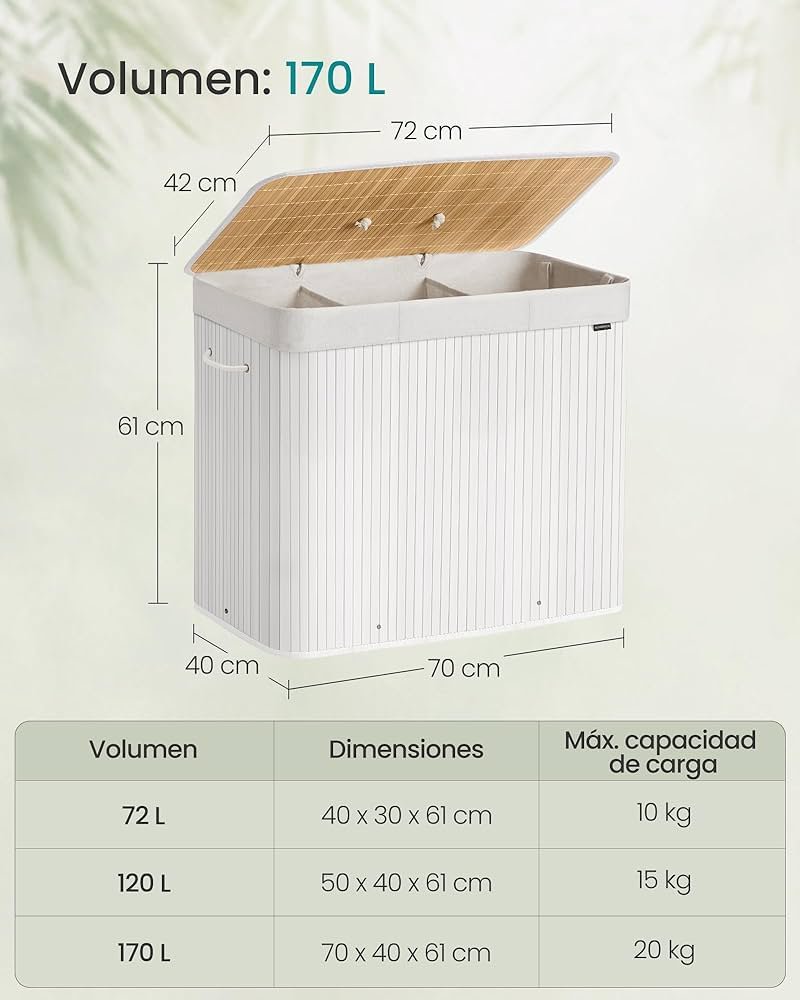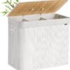 SONGMICS Cesto de la Ropa Sucia con Tapa, 3 compartimentos, 170 L, Cesta de Lavandería de Bambú, Plegable, con Bolsa Lavable Extraíble, Asas, para Lavandería, Dormitorio, Blanco LCB013W01