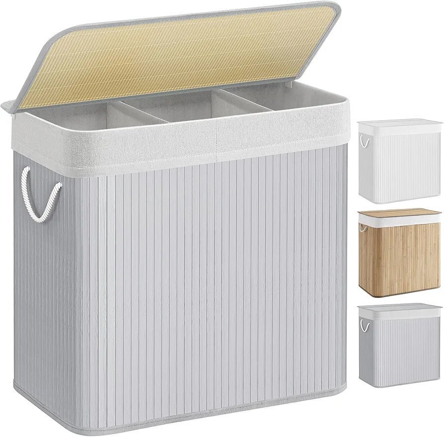 SONGMICS Cesto Ropa Sucia, 150 L, Cesta Colada 3 Clasificaciones, con Tapa, Bambú, con Asas, Plegable, Bolsa Interior Extraíble y Lavable a Máquina, para Lavandería, Dormitorio, Gris LCB0091G01