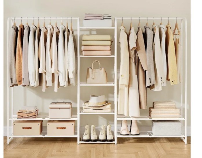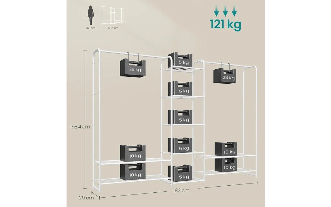 Este perchero ofrece un amplio espacio para colgar (125 cm de altura), también es adecuado para prendas largas. Los 9 estantes ofrecen espacio adicional para sus cajas, bolsos y otros accesorios
