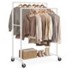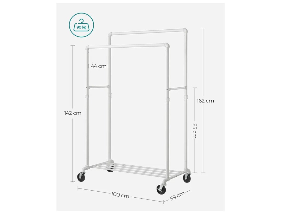 SONGMICS Perchero Burro de Doble Barra, Marco Metálico, 59 x 100 x 162 cm, Burro de Ropa con Estante de Almacenamiento y Ruedas, 2 Ruedas con Freno, Carga de 110 kg, Blanco HSR060W01