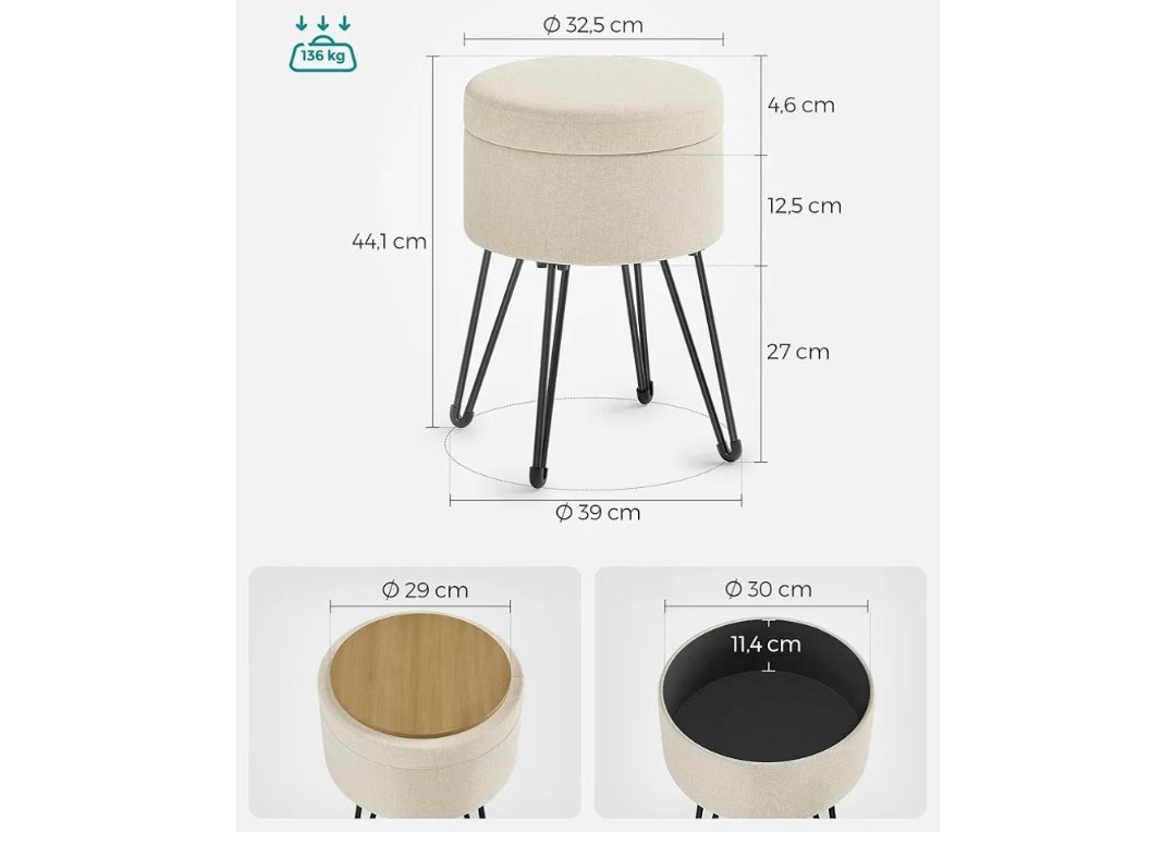 Coloca el puff almacenaje frente al sofá del salón – taburete reposapiés; colócalo frente al tocador – taburete de tocador; o da la vuelta a la tapa – mesa auxiliar