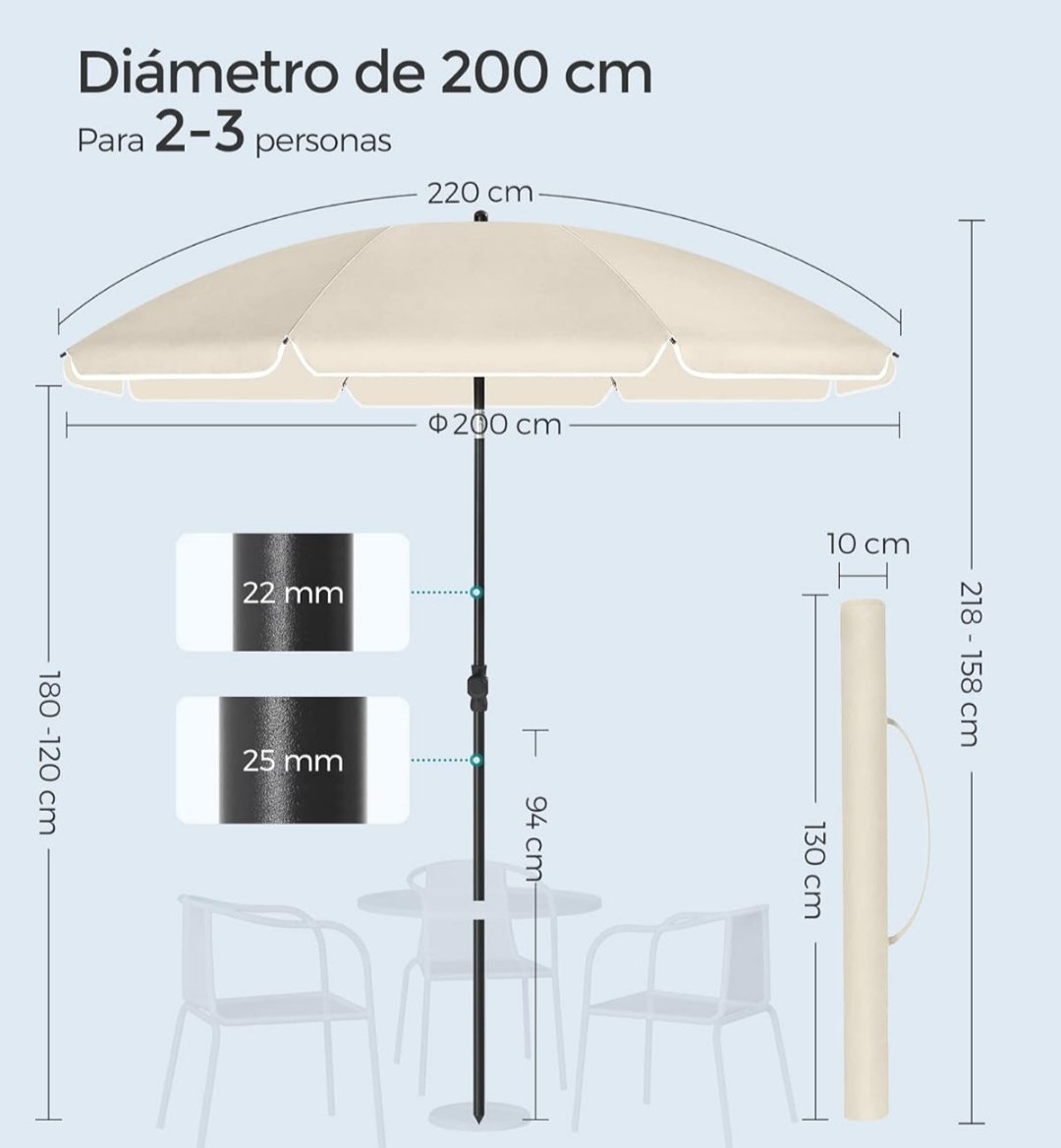 Esta sombrilla tiene una altura regulable de 60 cm y una inclinación bidireccional de 30° para protegerte del sol en cualquier momento. La junta de aleación de zinc es más resistente y segura que la de aleación de aluminio