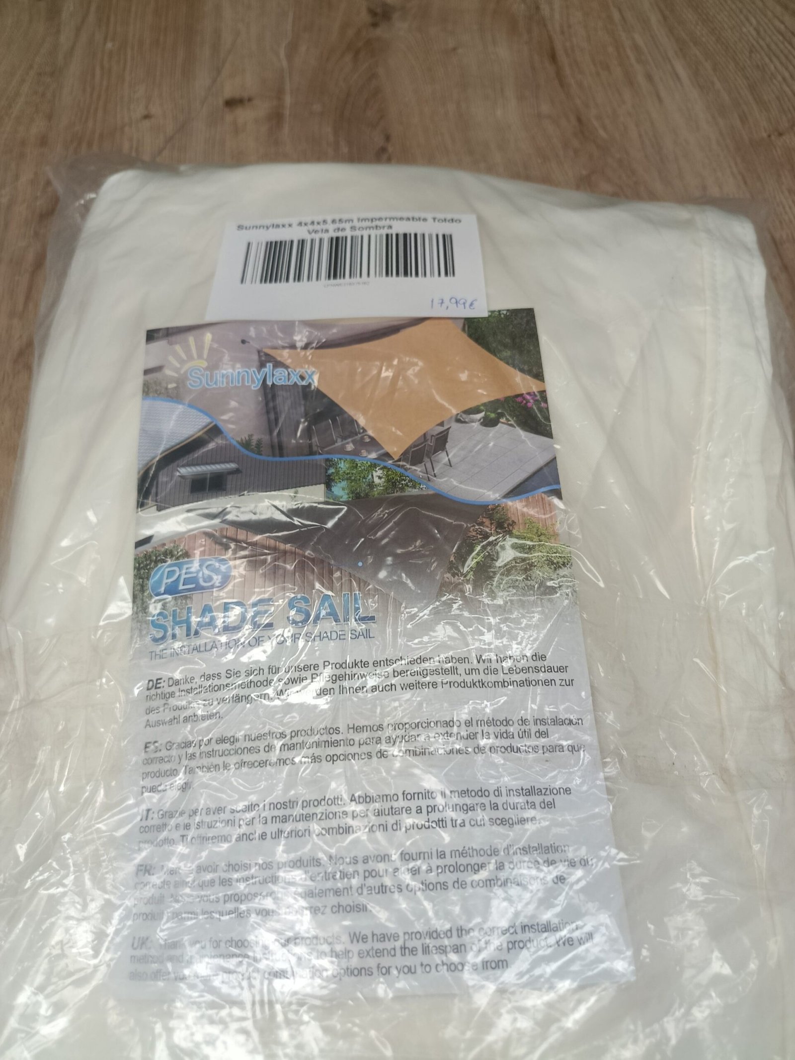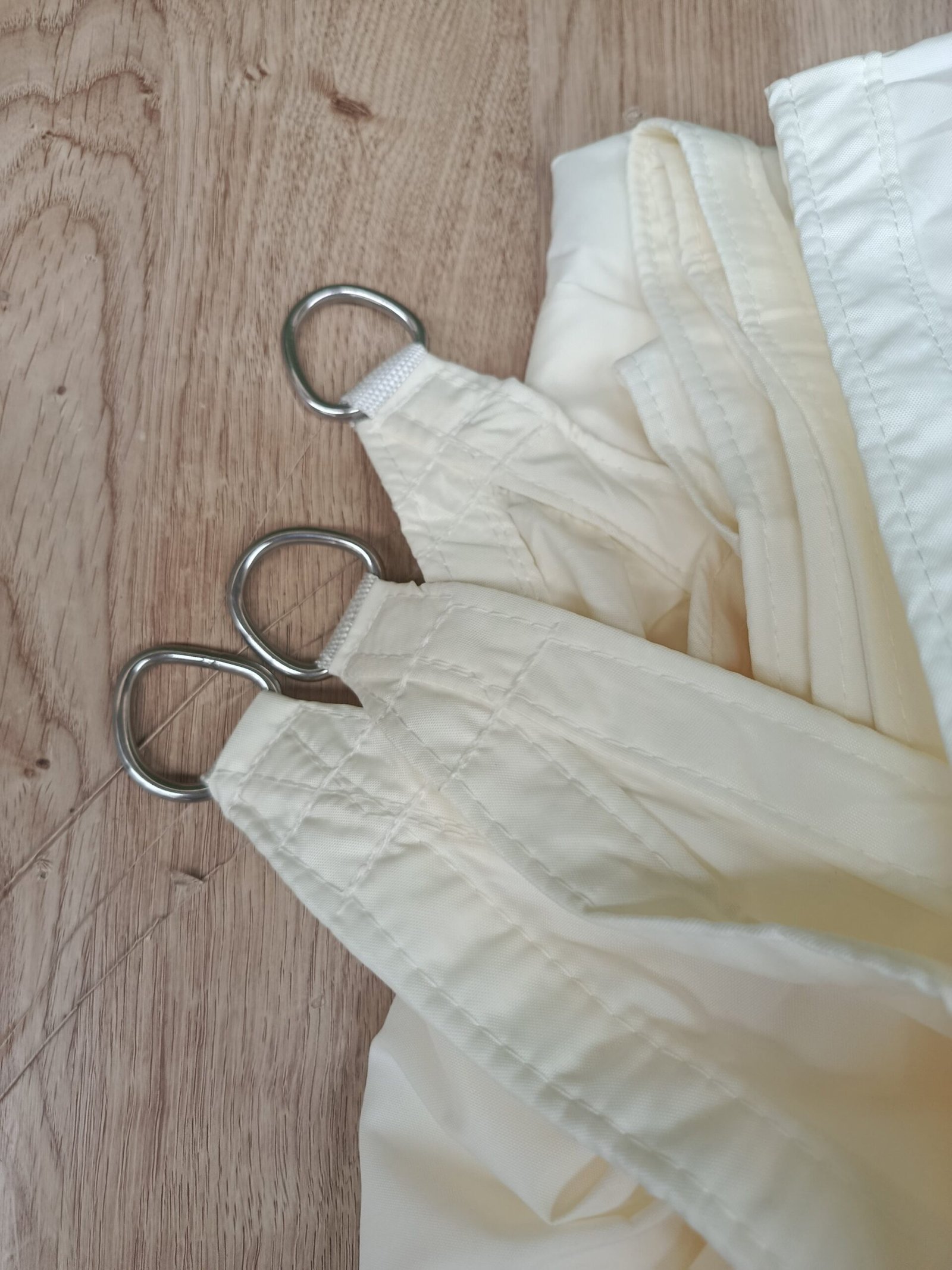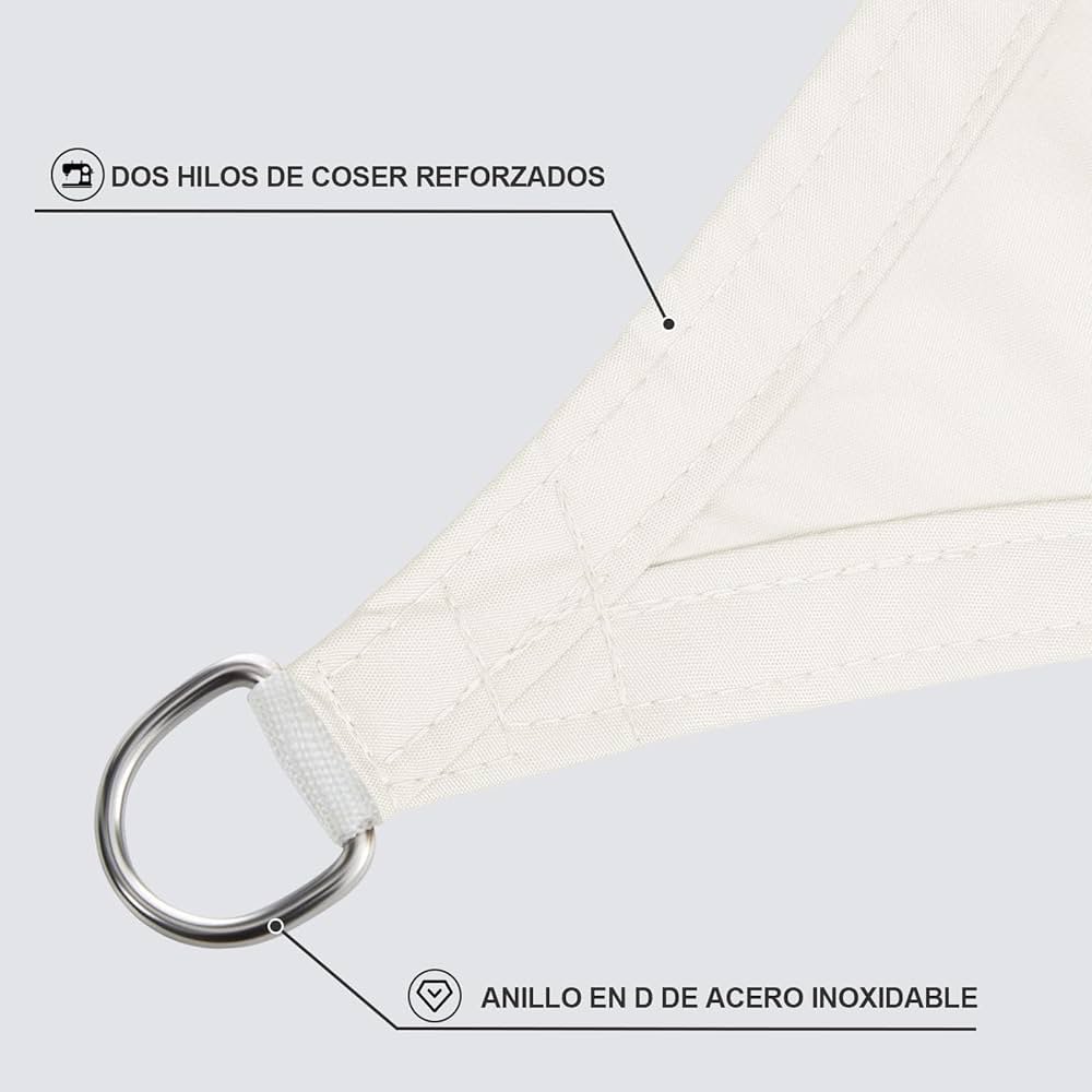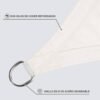 Material – Vela de sombra fabricada en poliéster de alta densidad. Nuestras velas de sombra tienen una densidad de 160 g/m², son ligeras e impermeables. Son resistentes al moho, a las manchas y no destiñen. No se recomienda la limpieza ya que dañará el revestimiento impermeable.