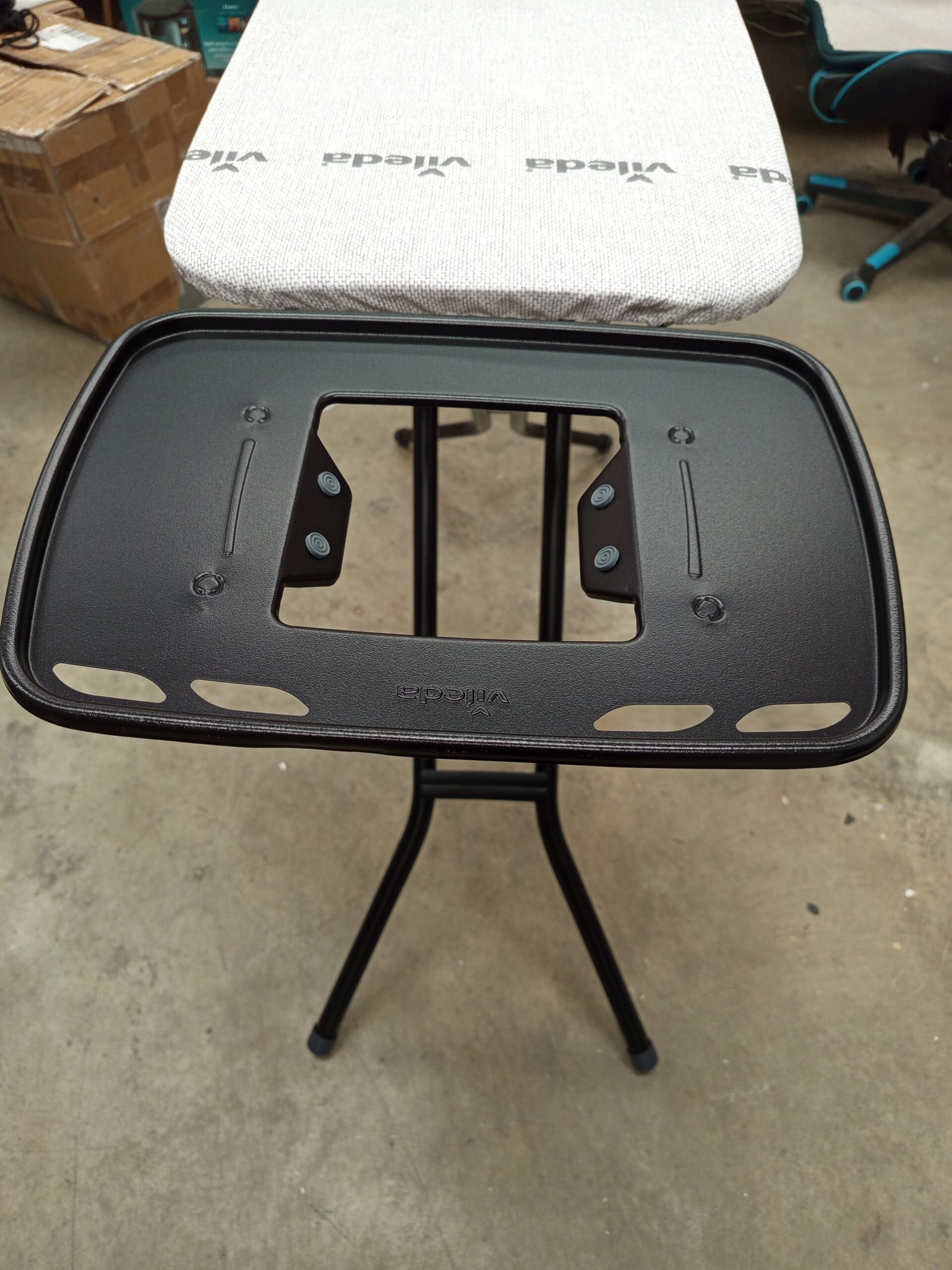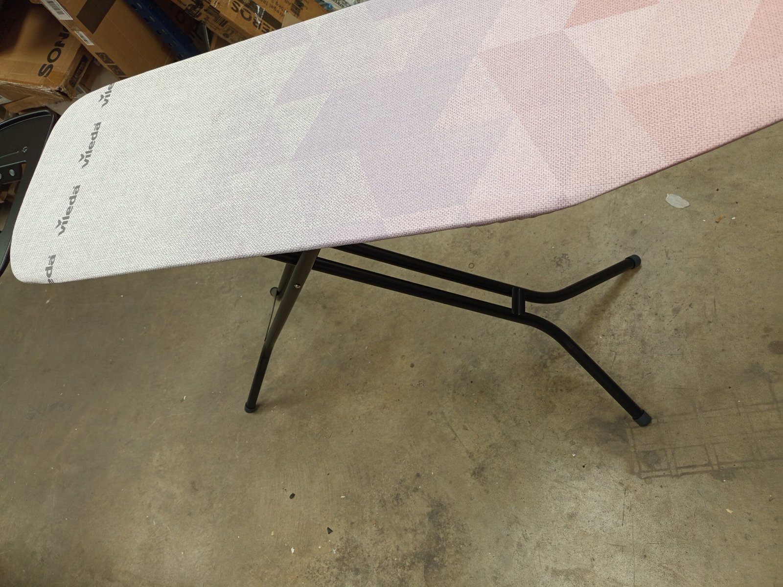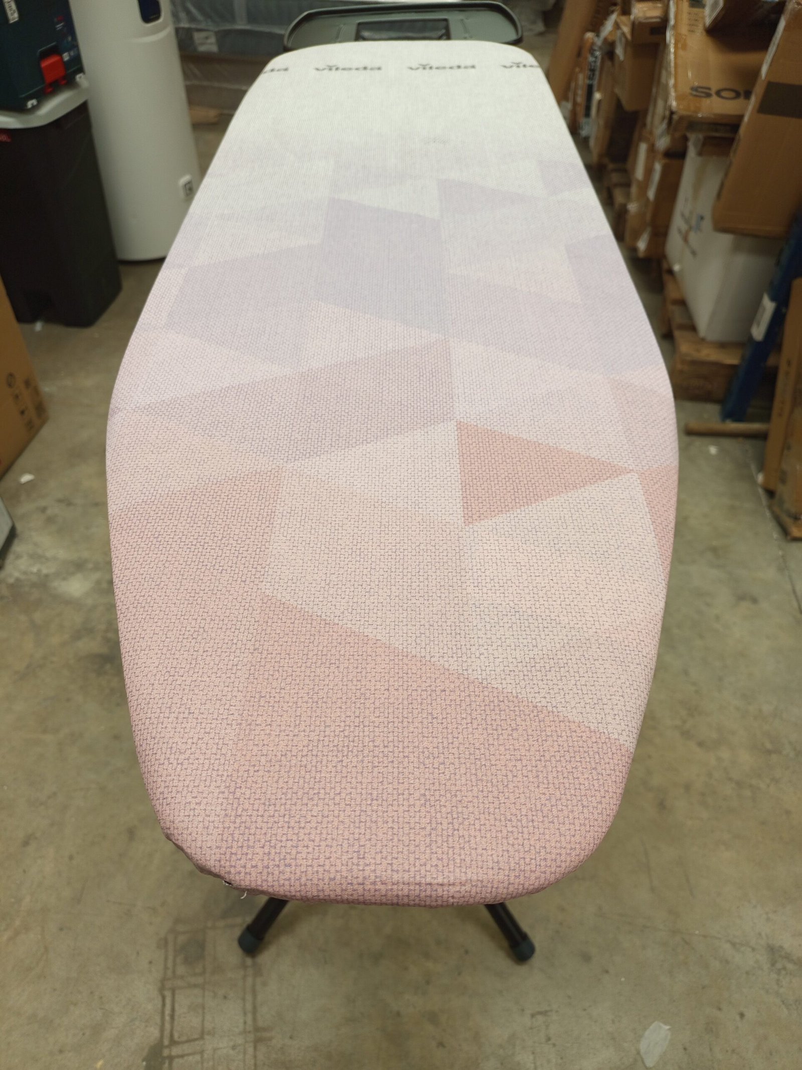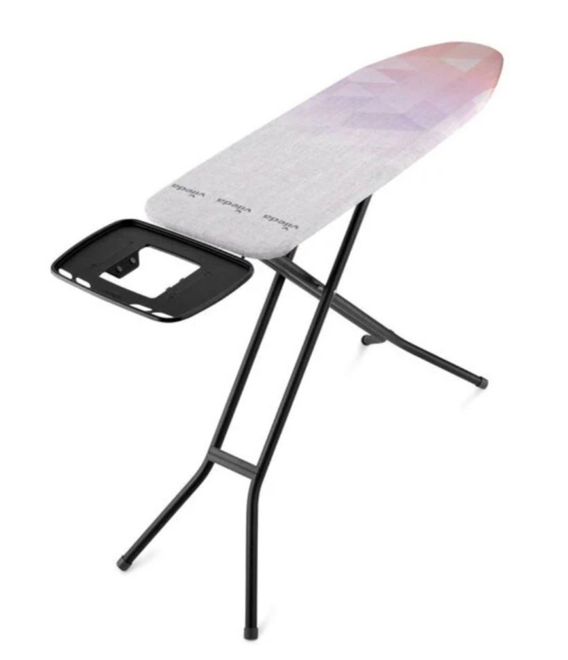 La tabla de planchar Vileda Diamond S tiene una superficie de planchado compacta (120×38 cm) y un soporte para la plancha con orificios para colgar perchas.