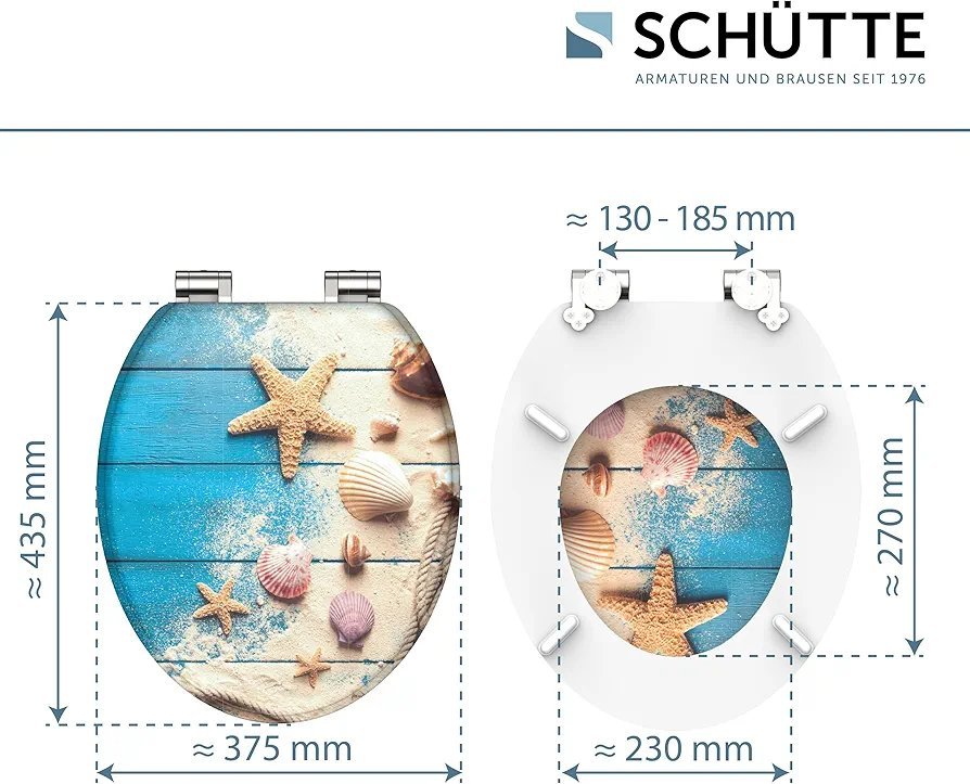 SCHÜTTE Tapa WC Madera Universal | Asiento de inodoro con dispositivo de descenso automático | Tapa vater WC Universal extraíble de irrompible | Tapa y gafas de hasta 250kg | BEACH
