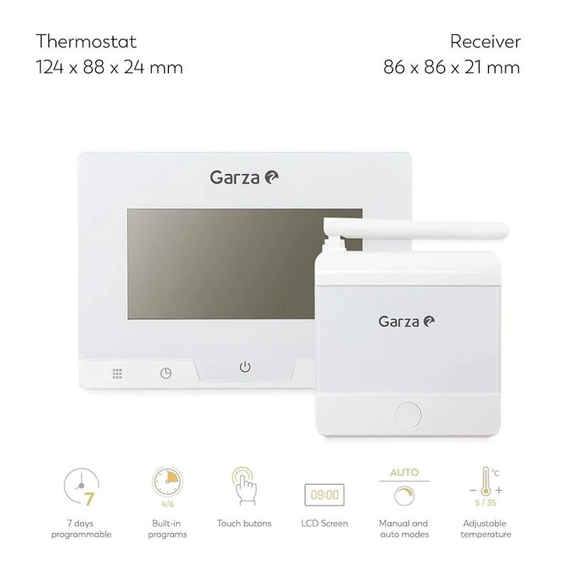 Garza – Termostato Digital Inalámbrico Programable, Controlador de temperatura para caldera y calefacción, Pantalla táctil, Blanco