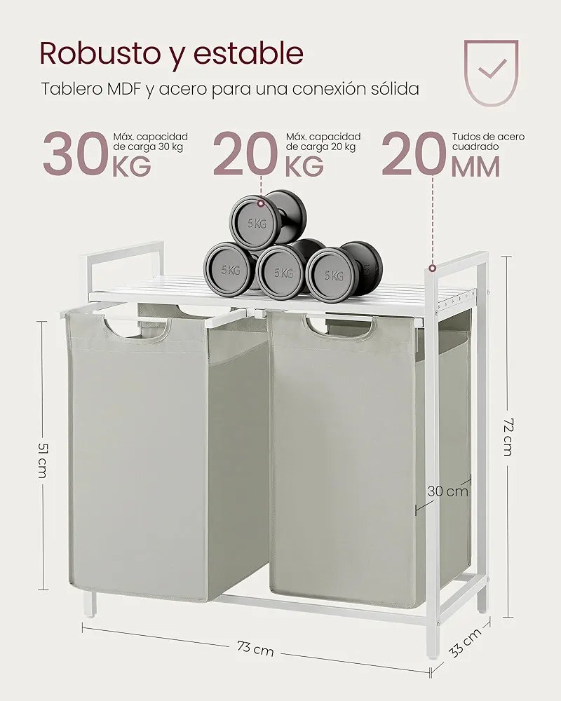 2 compartimentos: Este cesto frece una capacidad total de 92 L (46 L por bolsa); el diseño de 2 compartimentos ayuda a organizar prendas por tipo o a dividir las claras de las oscuras