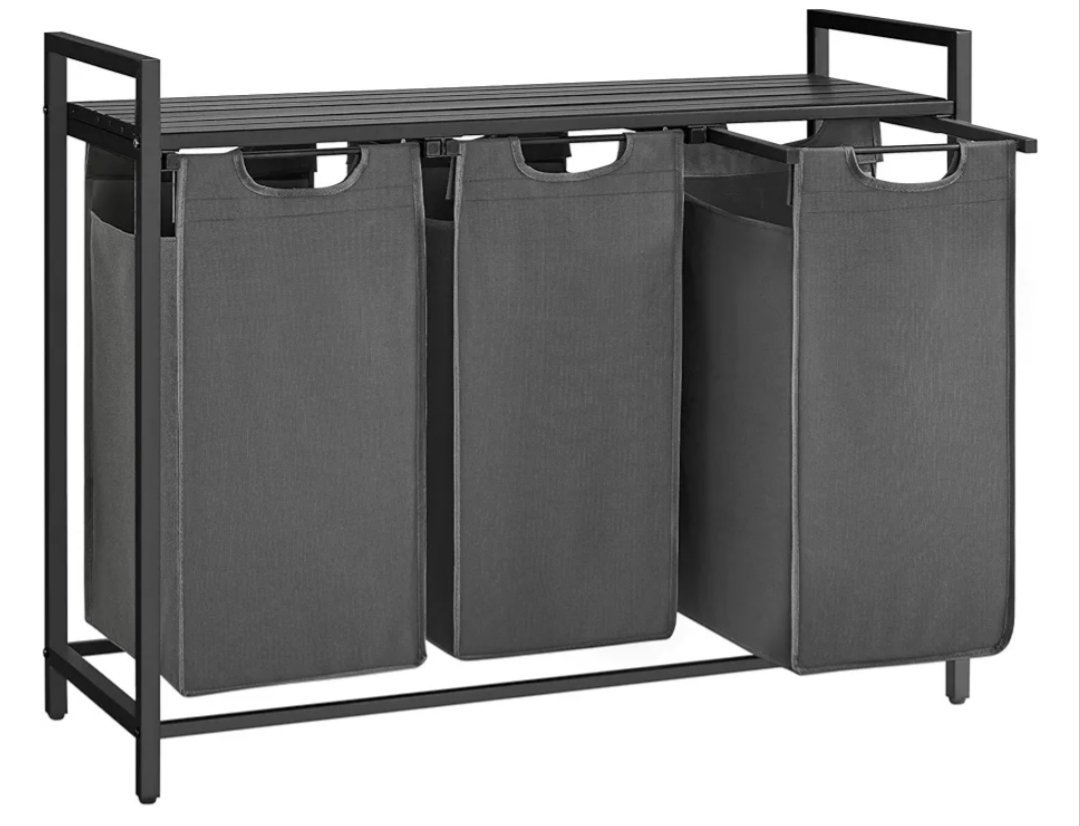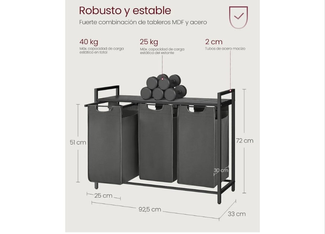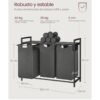 Este cesto ofrece 120 L (40 L para cada bolsa); el diseño de 3 compartimentos le ayuda a organizar la ropa por tipos o a dividir la ropa clara de la oscura