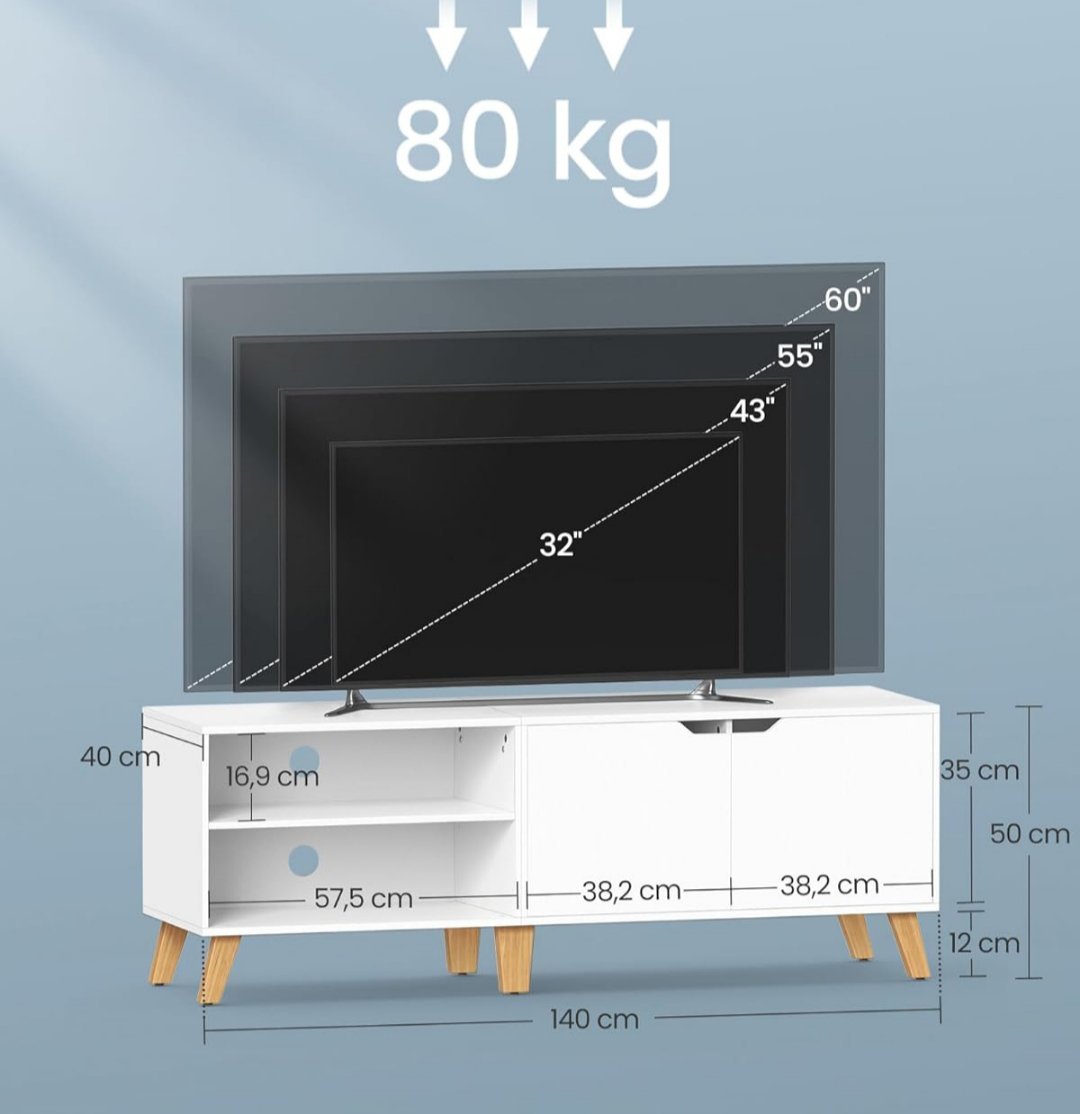 VASAGLE Mueble de TV de 2 Puertas, Soporte de TV con Estantes Ajustables, Largo de 140 cm, para Televisores de 60 Pulgadas, para Salón, Comedor, Dormitorio, Blanco LTV027T46