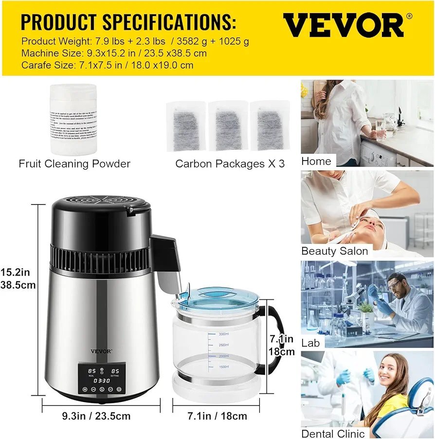 VEVOR Destilador de Agua 4L Filtro de Destilación de Agua con Recipiente de Vidrio 750 W 1 L/H Ajuste de Velocidad, Destilación Filtro Purificador de Acero Inoxidable Temperatura Doble 7,9lbs, Plata