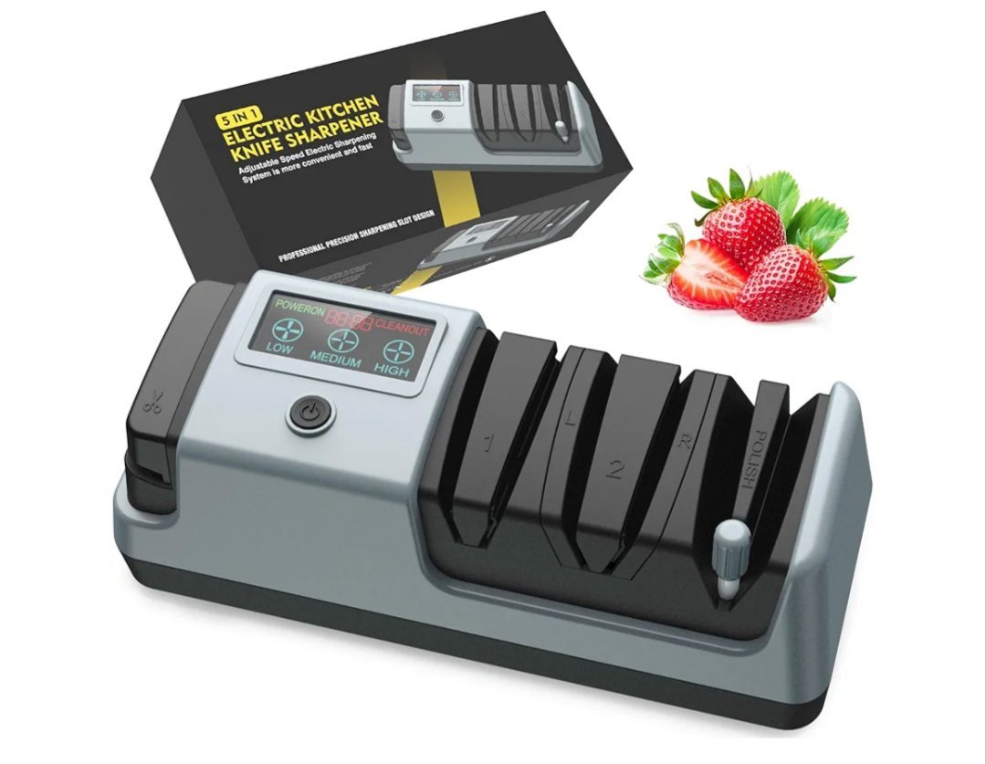 YORLEAY Afilador de cuchillos eléctrico 5 en 1, 3 velocidades de rotación, ajustable para hojas rectas, dentadas y de picar, también para tijeras